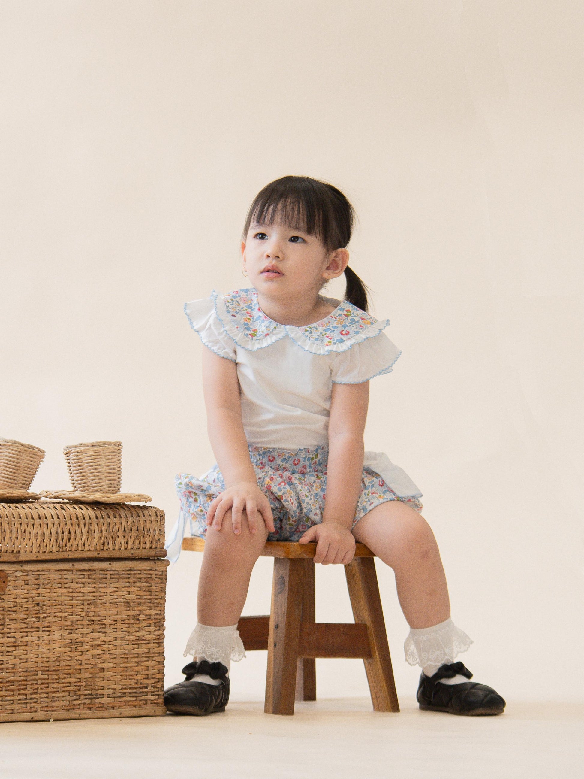 Soft, breezy, and full of charm — the Belle Meadow Set is perfect for sunny days and special little moments. It features a crisp white top with flutter sleeves and a frilled Peter Pan collar embroidered with delicate florals. The high-waisted bloomer-style shorts come in a pastel floral print with soft blue bows on each side, making it an effortlessly pretty choice for playdates or garden parties.